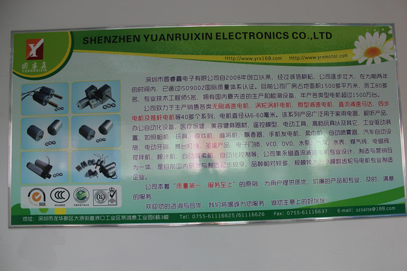 深圳市圓睿鑫電子有限公司自2008年創(chuàng)立以來,經(jīng)過誠信耕耘,在為期兩年的時間內(nèi),已通過ISO9001:2000國際質(zhì)量體系認證。公司廠房占地面積2000多平方米,員工100人,專業(yè)技術(shù)工程師6名,擁有國內(nèi)最先進的生產(chǎn)和檢測設(shè)備,年產(chǎn)各類減速電機超過2~300萬臺。因公司發(fā)展需要,于2020年底,將生產(chǎn)基地遷往擁有最美小鎮(zhèn)之稱的東莞市清溪鎮(zhèn),依山傍水,依托美麗的大自然環(huán)境和地方文化,全新的東莞市圓睿鑫電子有限公司將借助深圳母公司平臺,一步步走上新的臺階。 東莞公司將繼續(xù)致力于生產(chǎn)銷售各類無刷減速電機 渦輪渦桿電機,微型減速電機,直流減速馬達,交流手搖發(fā)電機、同步電機及空心杯電機等,電機直徑從6-60毫米為定位,系列產(chǎn)品廣泛用于智能家電、智能辦公自動化設(shè)備、智能醫(yī)療、美容健身器材、遙控模型、電動工具、高檔玩具以及其它工業(yè)驅(qū)動裝置,如高檔玩具、游戲機、麻將機、飄香器、手機發(fā)電機、柔巾機、自動噴霧器、汽車自動設(shè)施、電動牙刷、舞臺燈飾、圣誕產(chǎn)品、智能電子門鎖、VCD、DVD、水泵、氣泵、水表、煤氣閥、電磁閥、攪拌機、榨汁...